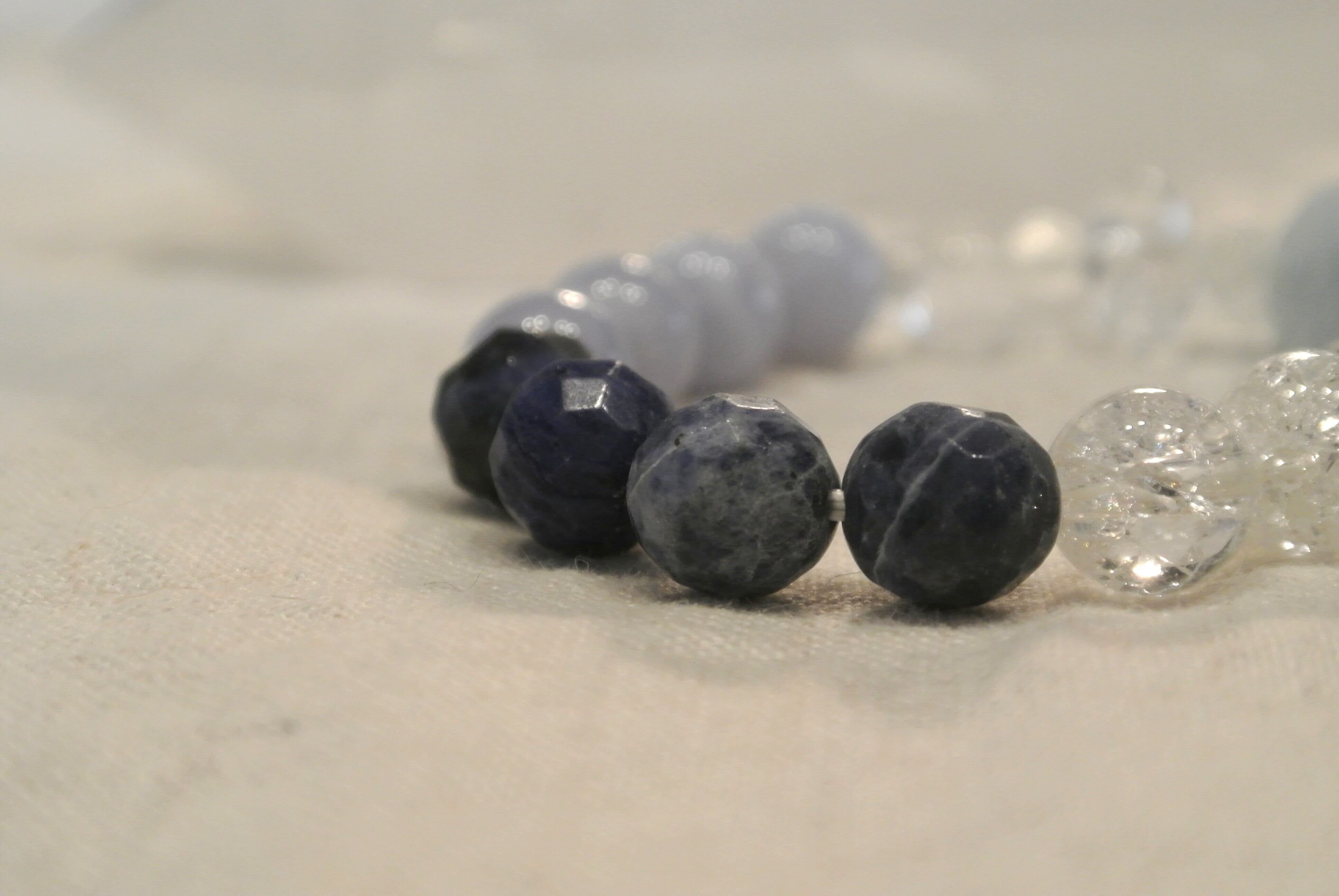 澄んだ海の様な大粒【アクアマリン】をメインに、マッドな質感の【ソーダライト】霞みがかった春の空の様ながブルーレースアゲート】に雫形水晶とクラック水晶を合わせました✨