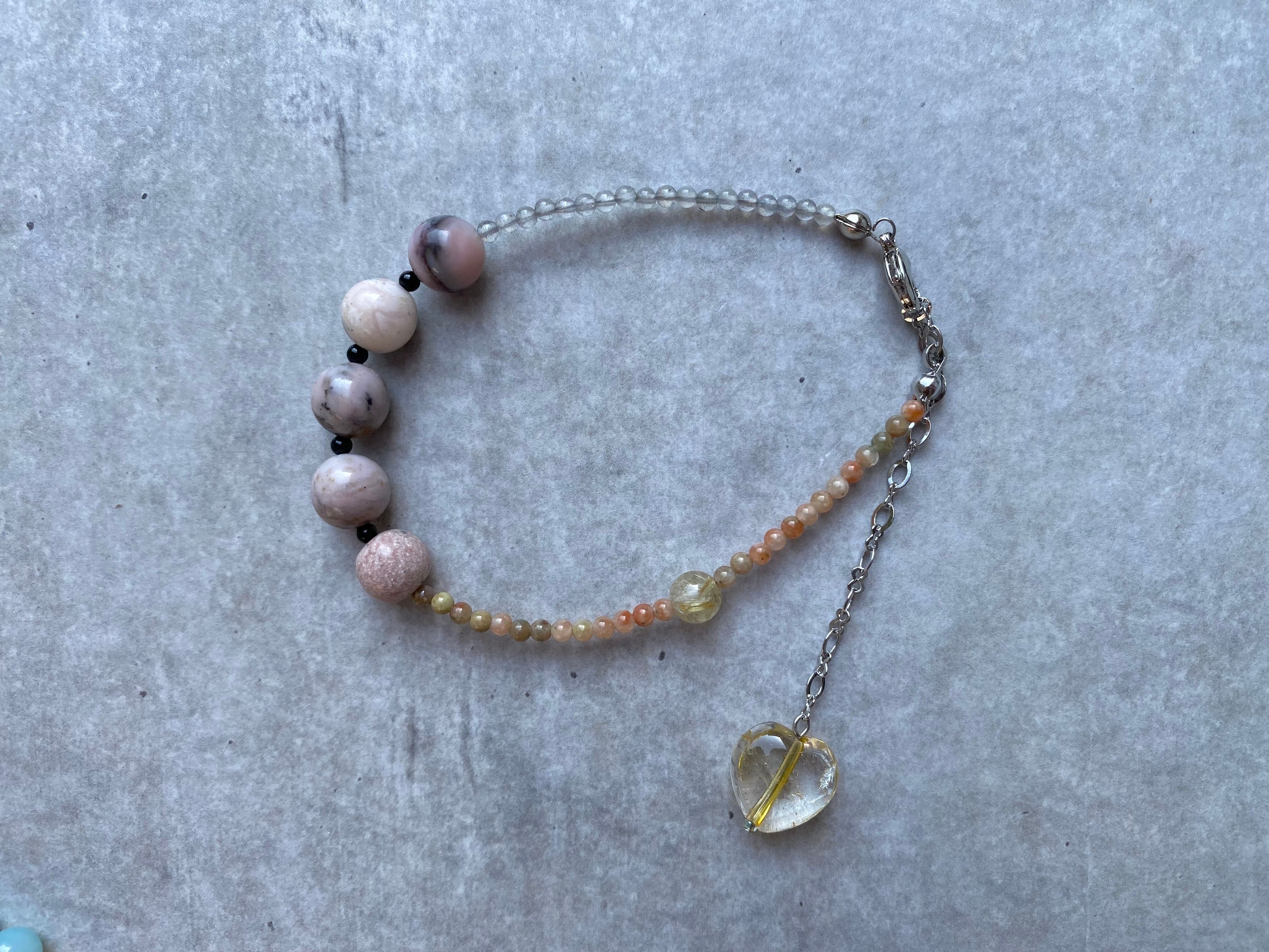 ジャスパー、ラブラドライト、ルチルクォーツ、レモンクォーツ、オニキスといった5種類の天然石を贅沢に使ったブレスレット「ジャスパーmix」。